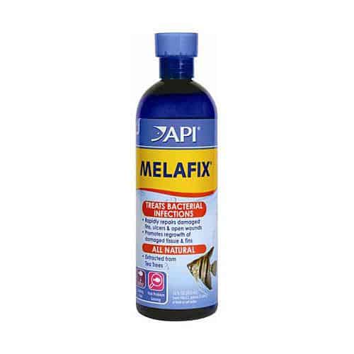 API Melafix is an all-natural antibacterial treatment that works to treat infections in fish. Common bacterial infections are open wounds and abrasions, tail rot, eye cloud, and mouth fungus. API Melafix also promotes regrowth of damaged fins and tissue. Product may be used when adding fish to an aquarium – particularly to smooth the transition from store to home – and if an infection is suspected, but not yet diagnosed. Some fish bought in pet stores are already carrying diseases at the time of purchase, which may be difficult to detect in its early stages.