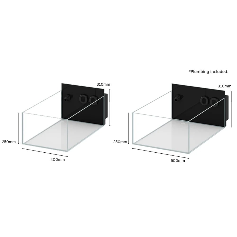 The display tank measures 50cm wide matching the footprint of the CADE Caddy cabinet. Best option when positioning the Reef X further away from the main display.