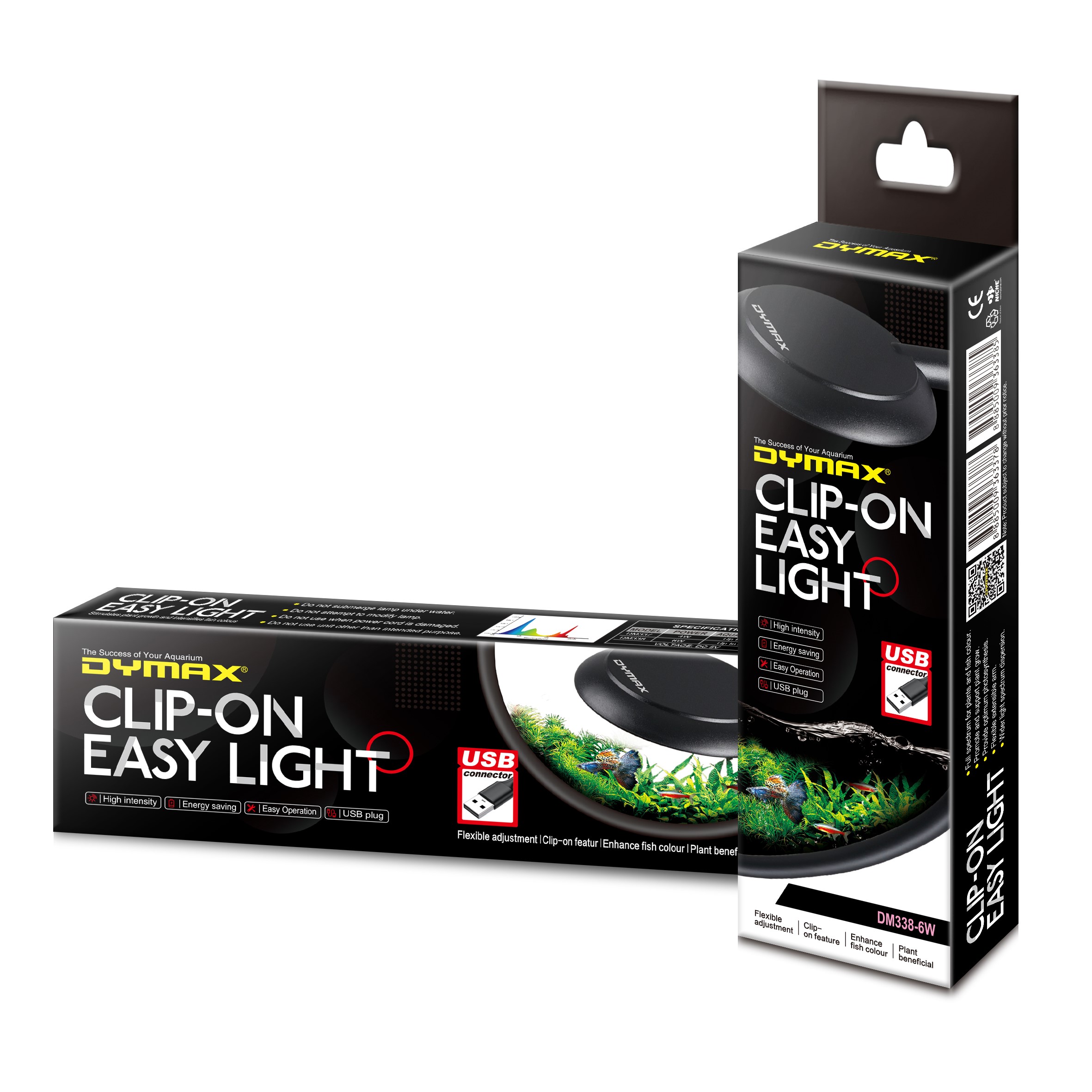 Dymax Clip-On Easy Light is full spectrum for plants and fish colour. Promotes and supports plant growth. Provides uptimum photsysnthesis. Flexible arm. Wider light spectrum dispersion. High intensity. Energy saving. Easy operation. USB Plug. 6W. DC 5V. Suits aquarium size: Up to 25cm.
