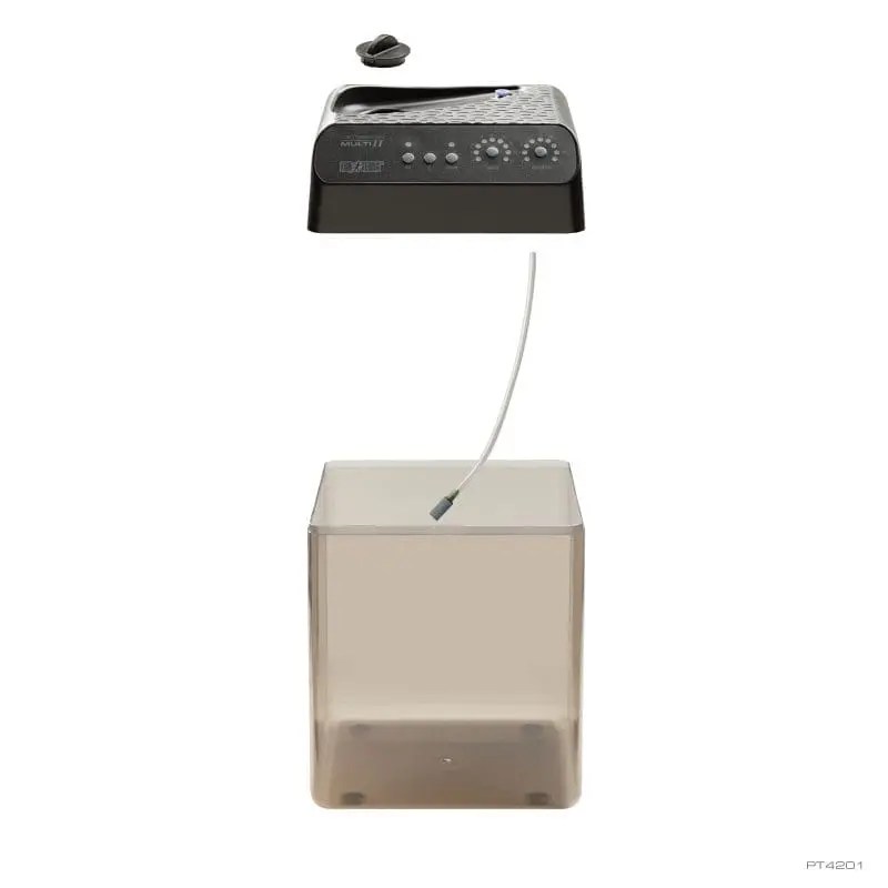 The Exo Terra® Monsoon MULTI II comes with two easy-to-install nozzles, but the system can be extended to accommodate up to 6 nozzles, making it ideal for multiple terrariums. (Please note that every additional nozzle will result in less performance from each nozzle installed.) The mist produced by these specially designed nozzles is extremely fine, creating a fog-like effect in the terrarium or greenhouse, and the extra long tubing makes it possible to conceal the unit in a storage area or under the terrarium in a cabinet.