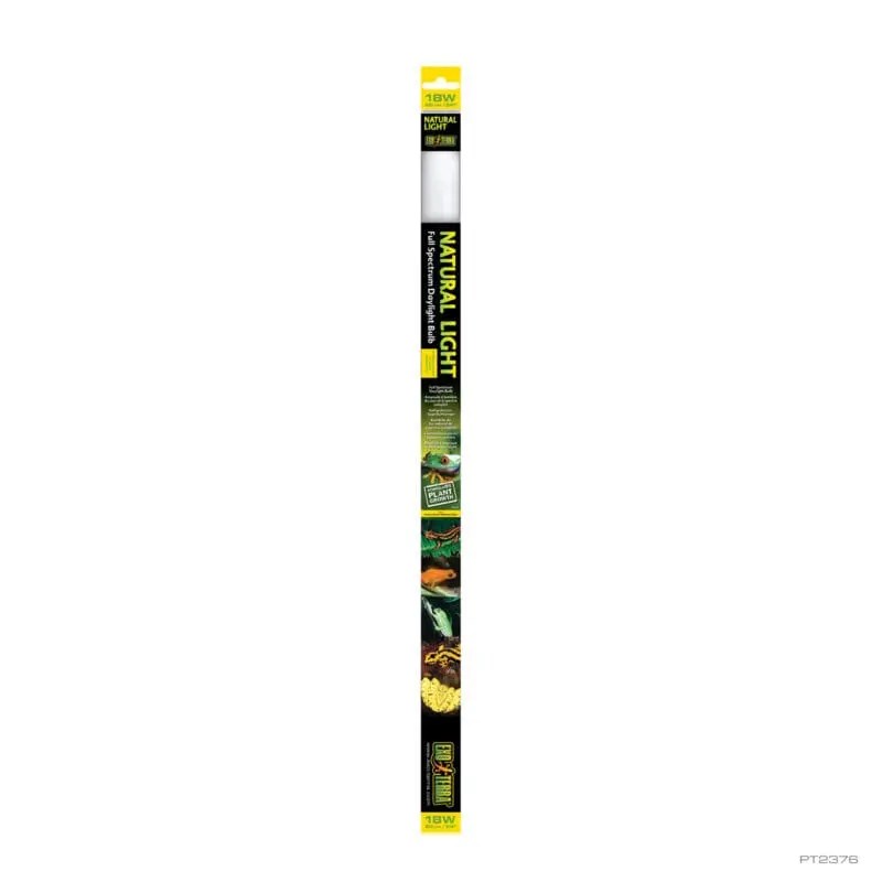 The Exo Terra Natural Light is a full spectrum daylight bulb, recommended as general light source for all terrarium types. As a result of the vivid wavelengths of light provided by the Natural Light, reptiles will experience and perceive colours from their environment more naturally. The Exo Terra Natural Light will help to improve the living conditions and physiological wellbeing of your reptiles. The specific wavelengths make this bulb suitable for planted terrariums and for animals with lower UV requirements, such as snakes, amphibians (frogs, toads and salamanders) and nocturnal animals.