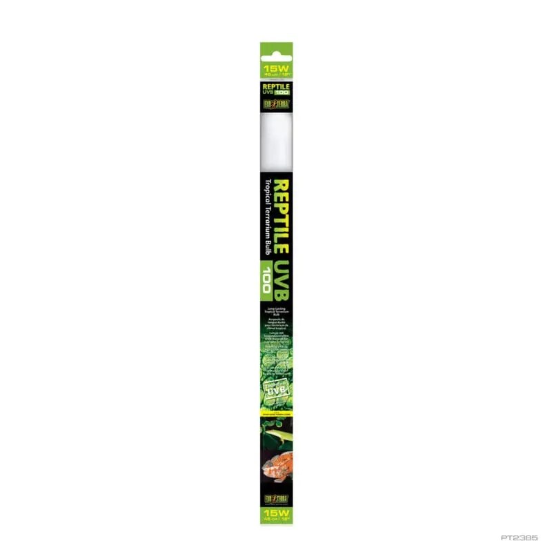 The Exo Terra Reptile UVB100 emits optimal levels of UVB, similar to that of shady environments such as rain forests or other tropical locations. Reptiles living in these habitats receive moderate UV radiation due to climatological conditions (fairly high humidity, changes in weather, etc) that prevent unfiltered sunlight from reaching the reptile’s basking site. The optimal Vitamin D3 yield index ensures vitamin D3 photosynthesis to aid calcium absorption and prevent metabolic diseases.