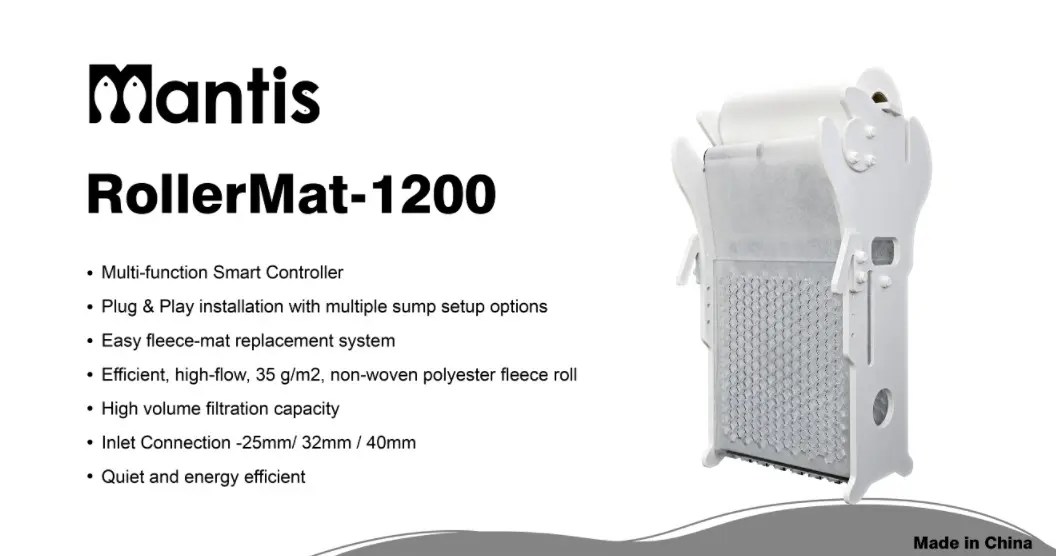 The Mantis Roller Mat Automatic Filter System is specially developed primarily for use in marine, tropical and freshwater aquaria to replace the use of filter socks and floss.