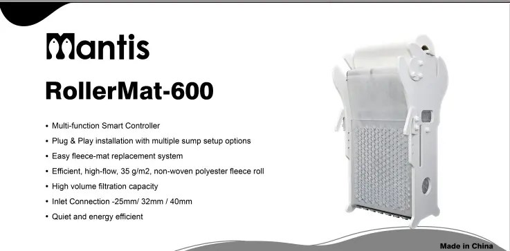 The Mantis Roller Mat Automatic Filter System is specially developed primarily for use in marine, tropical and freshwater aquaria to replace the use of filter socks and floss.