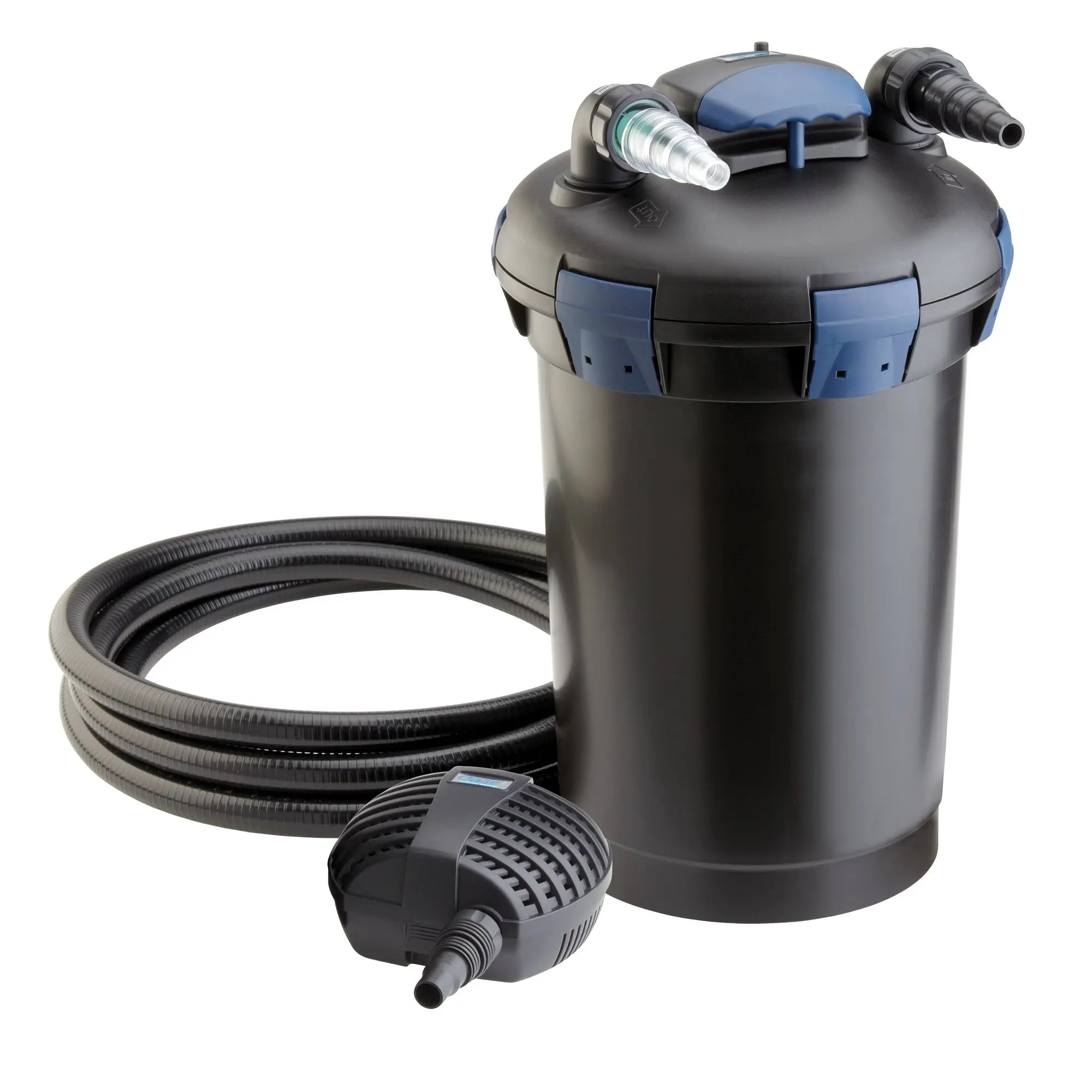 Complete set: install, connect, finished. Guaranteed clear water through the ideal combination of filter, pump and UVC technology for sterilisation. The filter is buried up to the cover and is virtually invisible in the garden. Maintenance is very easy thanks to the patented cleaning function in the cover. The degree of waste build up on the filter can be seen from outside. If desired, this solid pressure filter can also transport water to a higher watercourse.