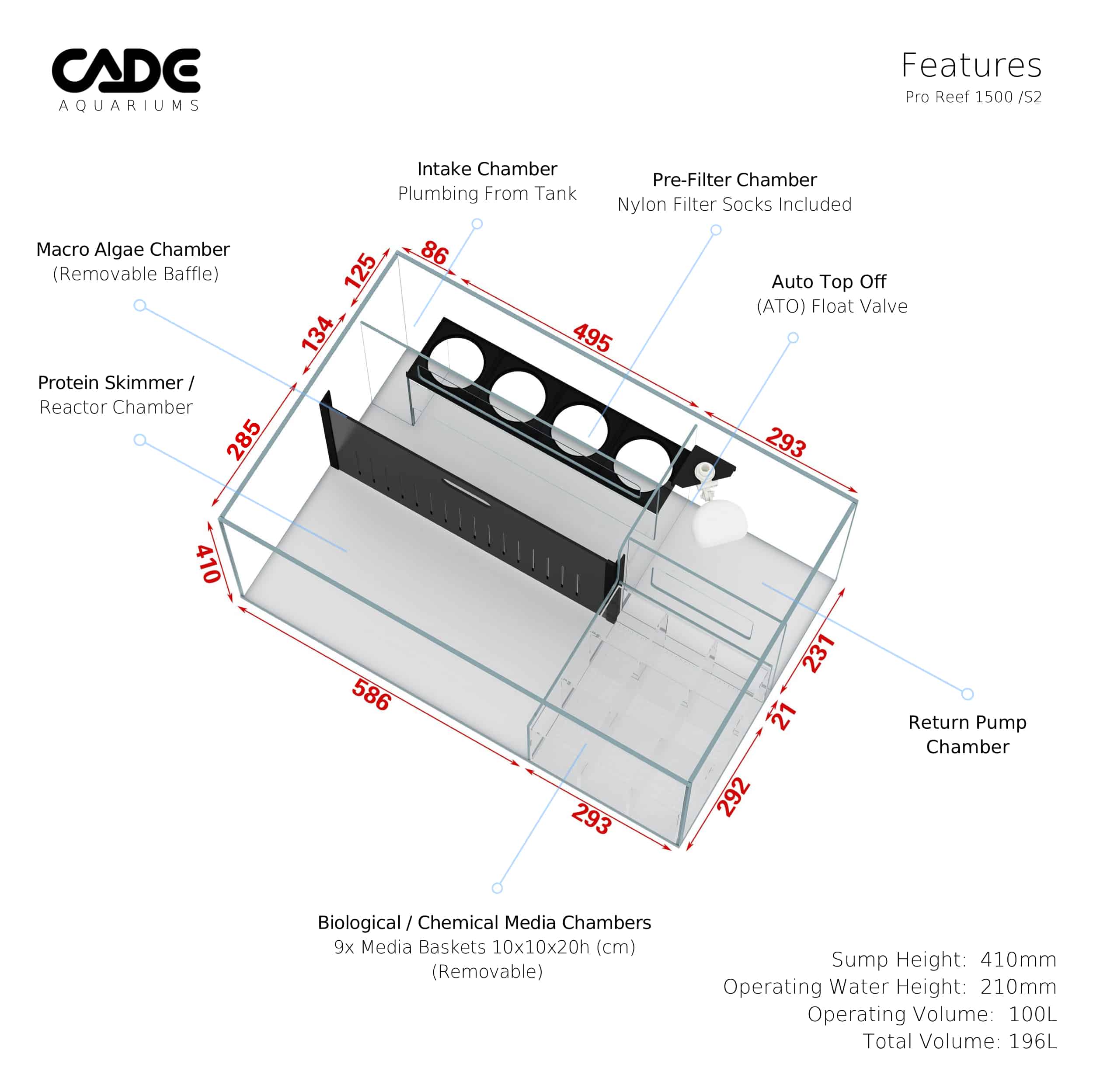 CADE Pro Reef S2 Sump filtration is a uniquely designed system that maximises space and provides endless versatility no matter what your filtration preferences are. Every model is equipped with pre-filtration sock/s a large Protein Skimmer / Reactor chamber, a Bio / Chemical Media Chamber and a Return Pump Chamber which also houses the ATO refill float valve that connects to the water storage reservoir in the rear of the tank. A very smart inclusion to the PR-S2 sumps are individually removable 10x10x20h (cm) media baskets which can be used for any form of Biological or Chemical filter media. Filter baskets offset the need for additional media reactors such as a Carbon Reactor which ultimately saves space and unnecessary additional expenses. A Macro Algae Refugium Chamber is included on models PR2-1200, PR2-1500 and PR2-1800. This feature is optional and the acrylic panel is removable if the space is required for alternative purposes.