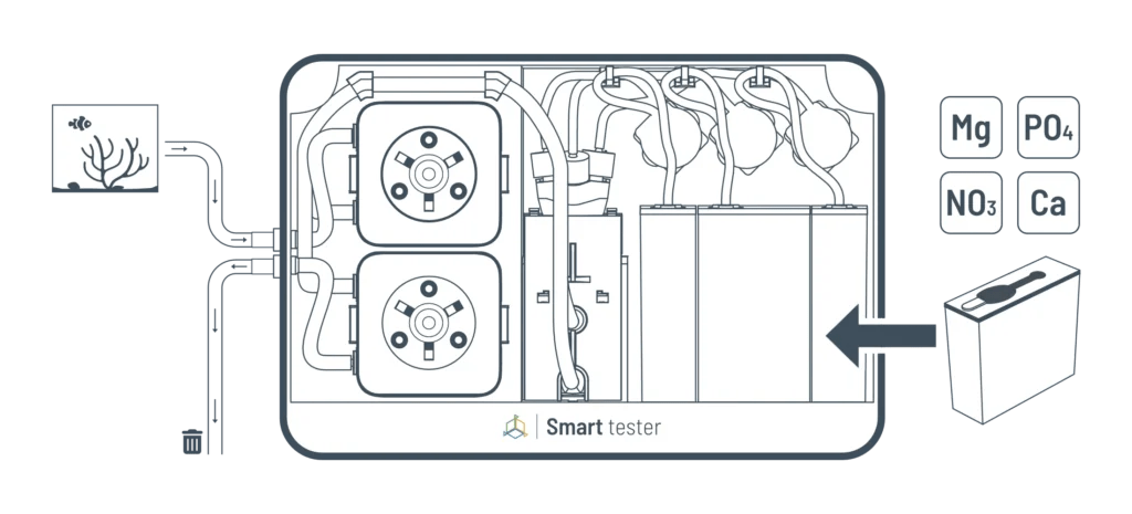 From now on, not only will you be able to automate the testing of the selected parameter PO4, NO3, Mg, Ca, but also, with the help of actions that integrate the Smart tester with dosing pumps, automate the maintenance of the selected parameter at a certain level.