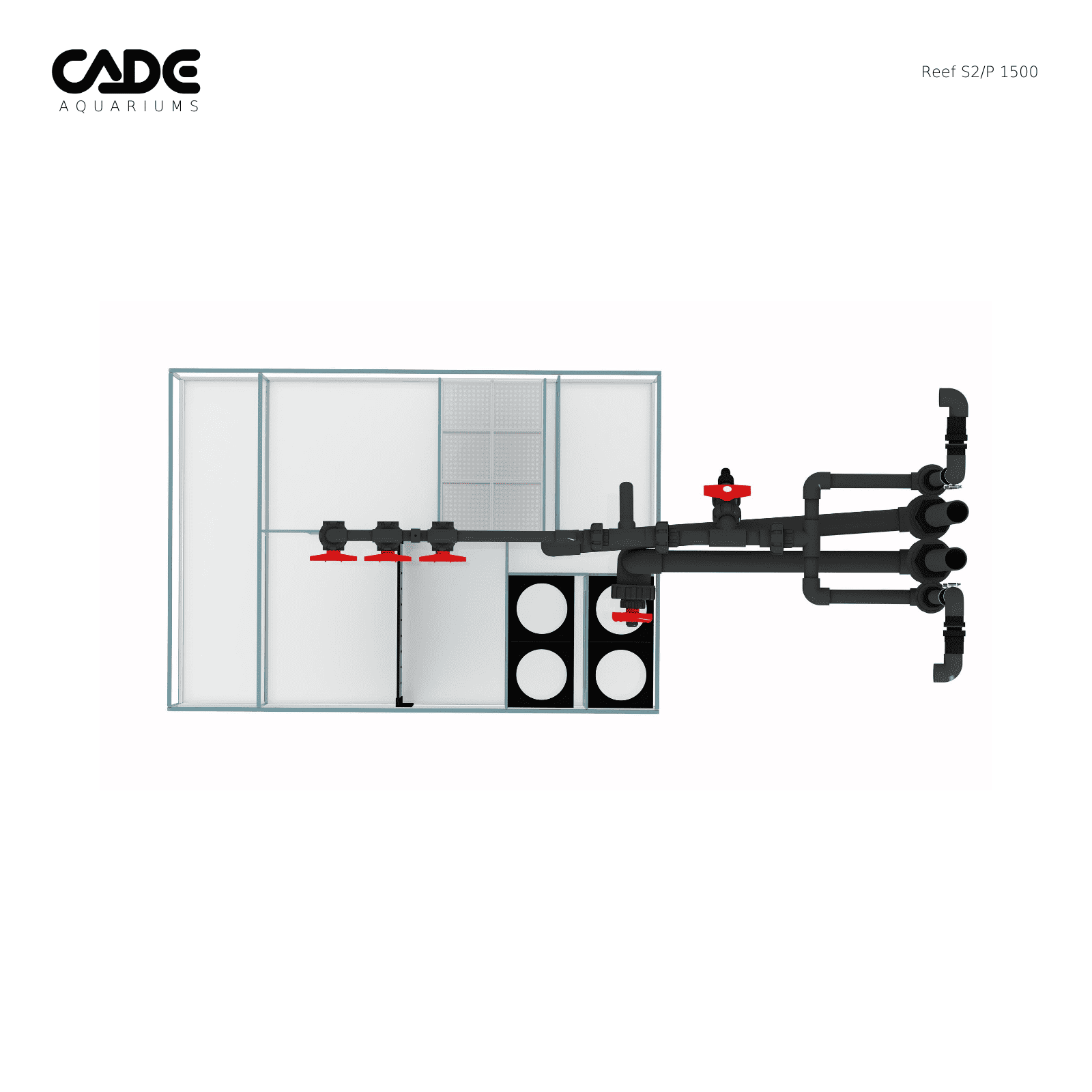 CADE Reef S2/P Plumbing is a pre-fabricated screw fit design that installs in minutes and requires no silicone. The plumbing starts in the weir with 2x down flow pipes (main drain & emergency). The main is fitted with a newly designed fine tuning gate valve for silencing the weir. The gate valve also enables adjustment of the Aquariums displays water height. Return flow to the Aquarium is via 2x 1″ pipes neatly concealed within the weir feeding water back into the tank on either side of the Aquarium. The entire system is extremely neat and designed to operate completely silent without modification.
